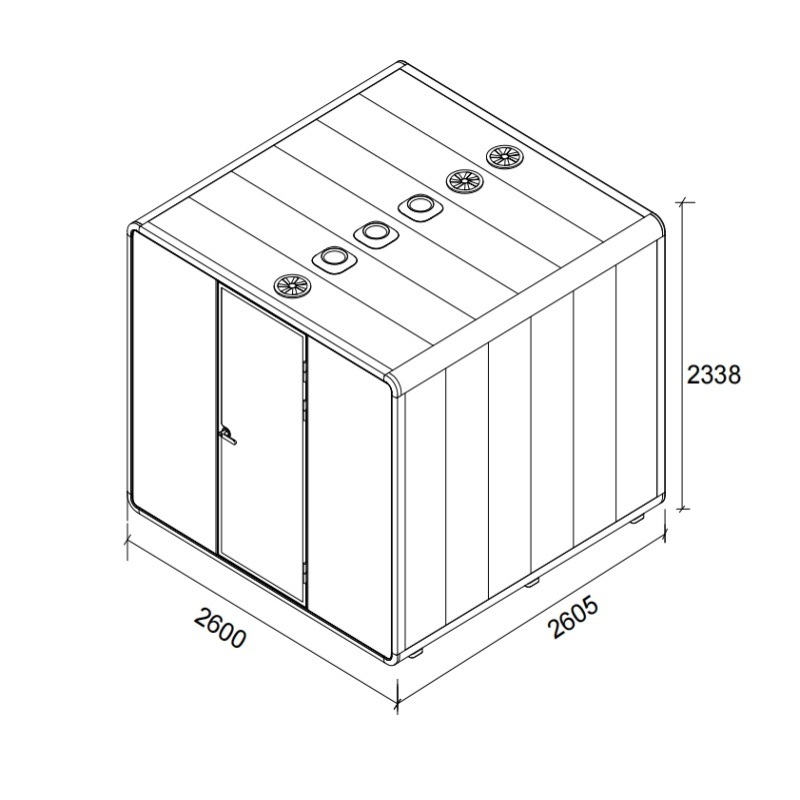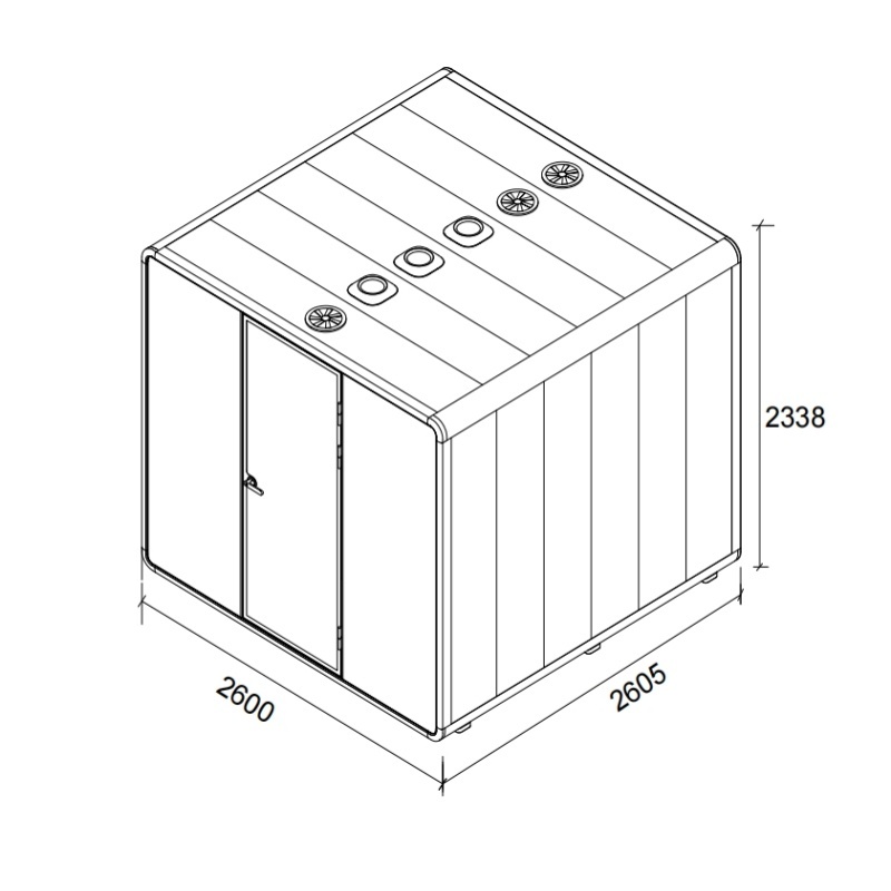 | الحجم الخارجي: | W2600*D2605*H2338MM | مواد: | الصلب والألمنيوم والألياف الصوتية والزجاج الرقائقي |